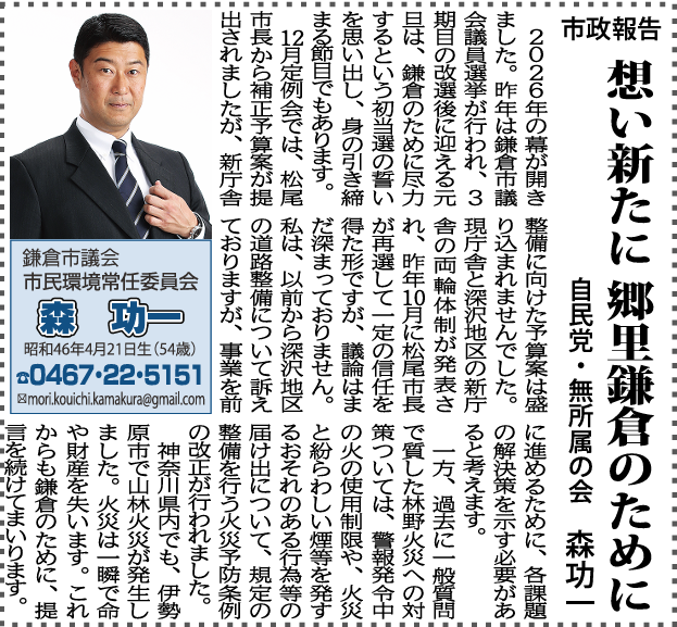 これまで支えてくださった皆さまへの感謝を胸に、暮らしの安全・安心、地域の活力、そして次世代につながる鎌倉の未来づくりに全力で取り組んでまいります。